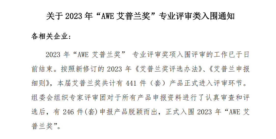 近日,中國家電及消費電子博覽會發布的關于2023年“AWE艾普蘭獎”專業評審類入圍通知,小家電公司生產的氫氣機(XY-H150S/R)代表集團成功入圍。由AWE組委會主辦的艾普蘭獎首創于2011年,在經歷了更名、升級、轉型等...